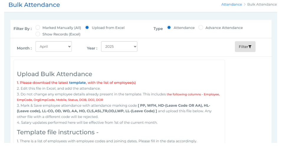Upload from Excel : In this section, you can download the provided Excel template and use it to update employee attendance in bulk. You need to follow the specified format and use the correct attendance marking codes while filling out the sheet. This helps ensure accurate attendance tracking and smooth payroll processing.