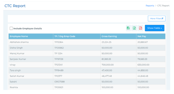This report displays the calculated Cost to Company (CTC) for each employee. You can filter the