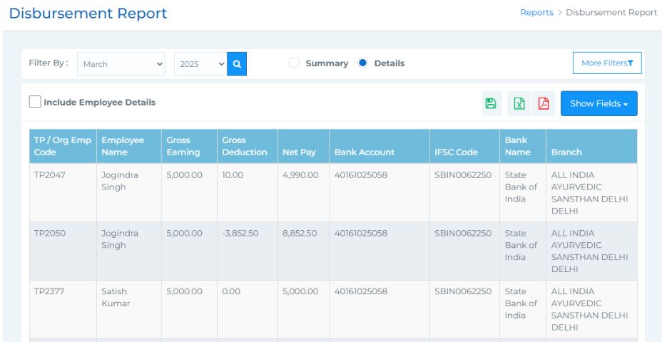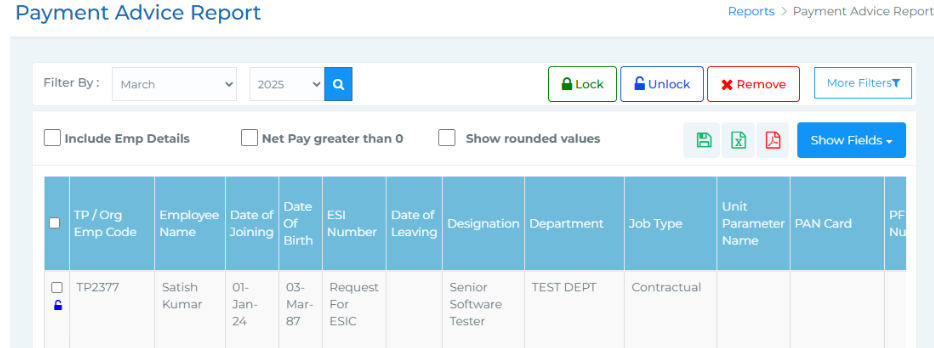 1. Payment Advice Report -  In this section, you can access detailed payroll reports once attendance is approved and salary structures are included. This report helps you manage, review, and export payment details for each employee in your organisation.